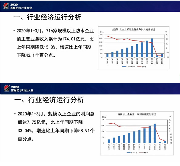 在會(huì)議現(xiàn)場,中國建筑防水協(xié)會(huì)秘書長朱冬青作出了關(guān)于《后疫情時(shí)期防水行業(yè)的挑戰(zhàn)和機(jī)遇》的主題演講,他從防水行業(yè)經(jīng)濟(jì)形勢分析、疫情對(duì)行業(yè)的影響分析和行業(yè)發(fā)展的挑戰(zhàn)與機(jī)遇等方面對(duì)主題演講進(jìn)行了專業(yè)解讀。朱冬青秘書長在演講中表示,今年一季度,受疫情影響,防水行業(yè)迎來了前所未有的收入及利潤雙下降,對(duì)行業(yè)發(fā)展帶來了不小的沖擊。